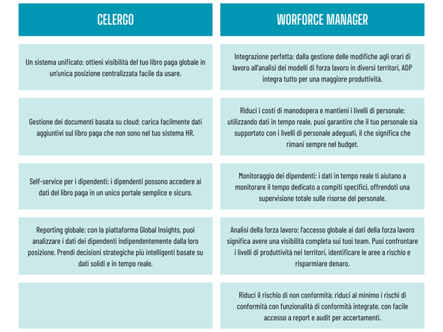 Caratteristiche essenziali fornite da Celergo e Workforce manager: