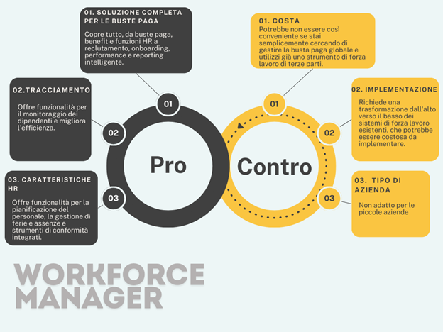 Workforce Manager è più adatto alle aziende che richiedono una gestione avanzata di orari e presenze, previsioni di manodopera e strumenti di pianificazione ottimizzati. Ad esempio, grandi rivenditori o produttori globali utilizzano Workforce Manager per pianificare i turni, monitorare le ore dei dipendenti e ridurre i costi di manodopera tramite strumenti di monitoraggio precisi. Inoltre, possono garantire la conformità alle leggi locali sul lavoro e gestire attività complesse di gestione della forza lavoro che possono trascinare verso il basso i team delle risorse umane.